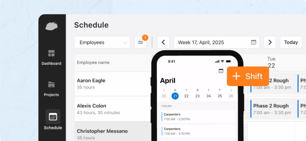 Soon, we'll be releasing labor scheduling capabilities to make it easy to plan one-time or recurring shifts, track projects and cost codes, and view real-time schedules—all without sacrificing ease of use.