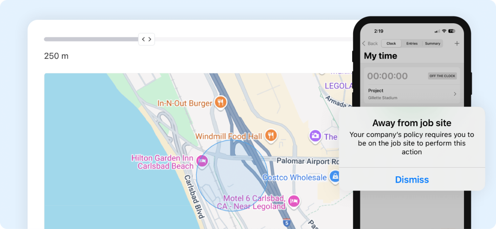 You can prevent employees from interacting with the time clock while outside of the project radius, flag employees while on the clock based on project radius, and push clock-related reminders based on location.